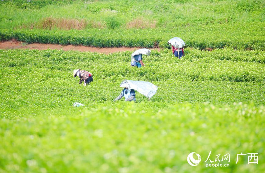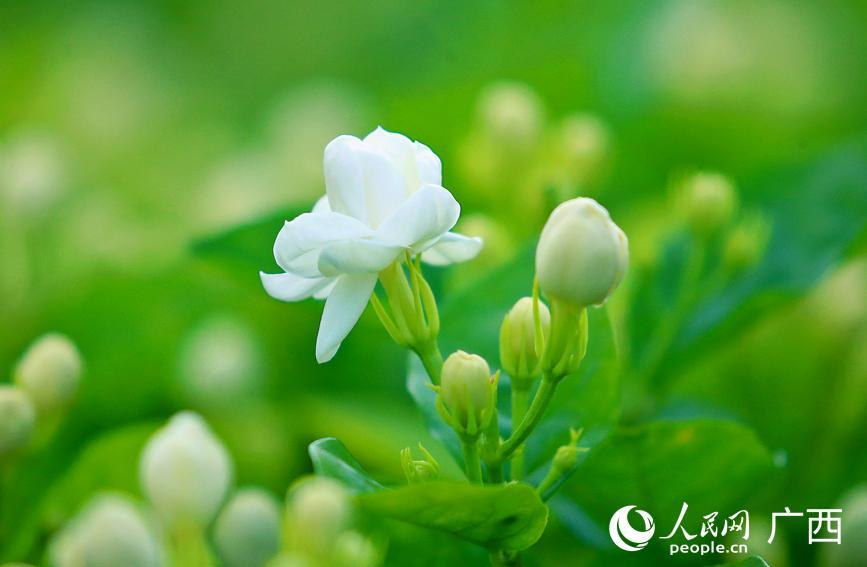 盛夏時節,廣西橫州市中華茉莉園,茉莉花在微風中搖曳,馥郁芬芳漫溢天地。花農穿梭花海之間,手法嫻熟地采摘茉莉花,一派繁忙景象。