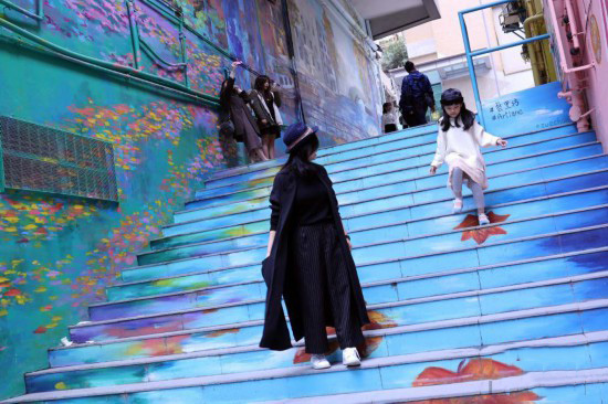 2月24日,一對情侶蒞臨“藝里坊”在奇靈里拍照打卡。每年的三月,是香港藝術月,世界各地最熱門的藝術展覽齊聚香港,第47屆香港藝術節、巴塞爾藝術展、及街頭藝術節目將精彩紛呈。而在西環的“藝里坊”,鮮艶的涂鴉成為訪港游客的熱門打卡地方。