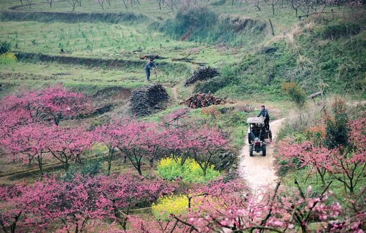遠山青、銀杏綠、淺草碧、油菜花田金黃,還有大片花開正艷的桃林……萬千色彩匯聚于這個小小村落,置身其間,滿目春色,叫人沉醉不已。