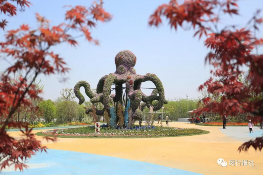 酷炫的章魚哥、撒了一地貓糧的幽靈貓、向往美好的小熊、等待布谷鳥公主的孔雀王子……公園里的不少動物造型花雕是小朋友們的心頭好。