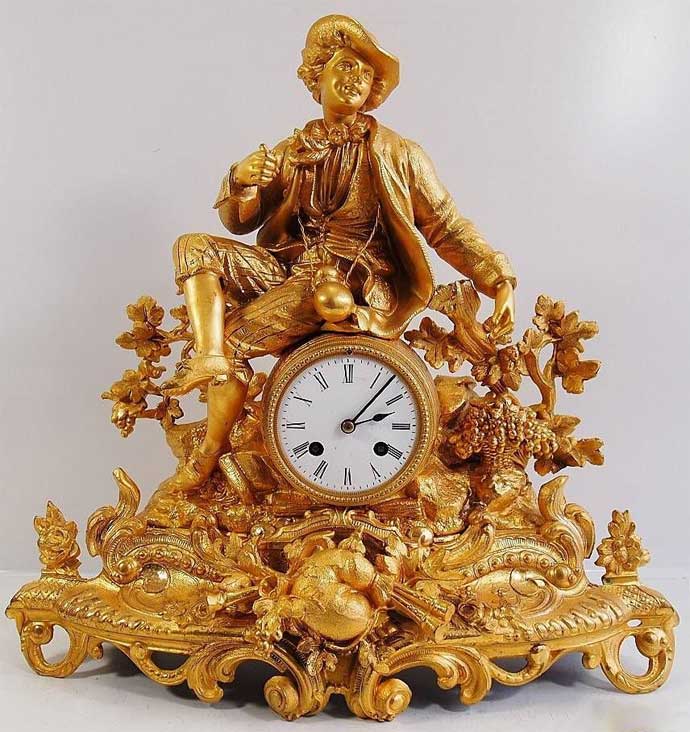 法國原裝名鐘JAPYFRERES19世紀紳士青銅鍍金超大座鐘。 產地年份:法國1880年代 特點:1,超大超重41cm高,近半米(41x41x15cm),可以堂而皇之的擺顯在客廳里! 2,一位紳士坐在頂部若有所思,堂皇的雕刻設計,布滿花卷和葡萄藤的雕刻裝飾見證100多年前法國能工巧匠的超凡技藝 3,法國最著名的鐘芯品牌JAPYFRERES歷經100多年的歲月,成色仍然上佳,走時準確,可見100多年來王宮貴族們如何的珍視溺愛。背部刻有制造者的名字! 4,手上鏈8天動力儲備,半點整點報時,聲音清脆悅耳 5,白色陶瓷表盤,外配凸玻璃門。